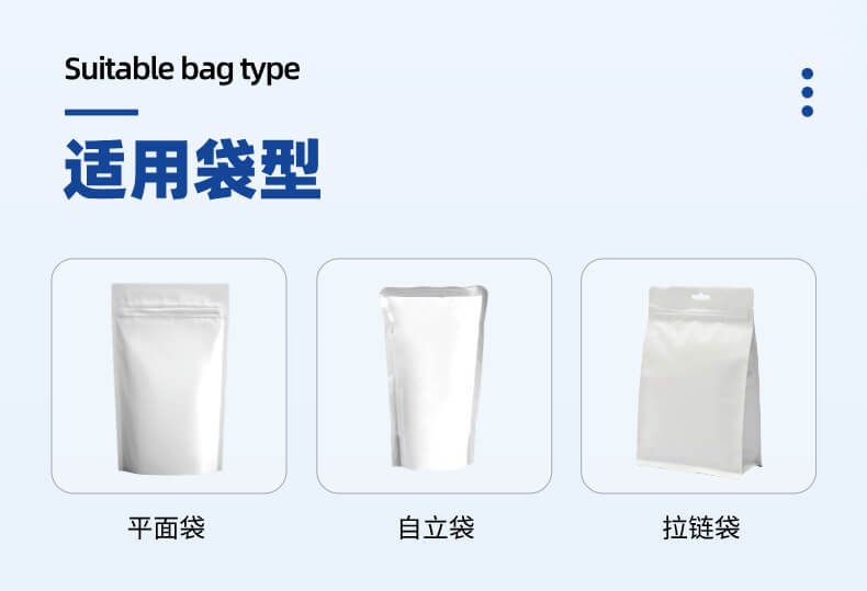 適用袋型:自立袋、拉鏈袋、斜嘴自(zì)立(lì)袋、平麵袋