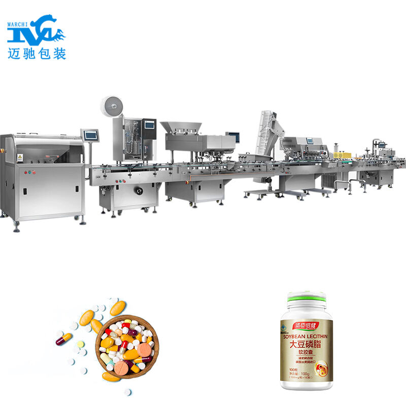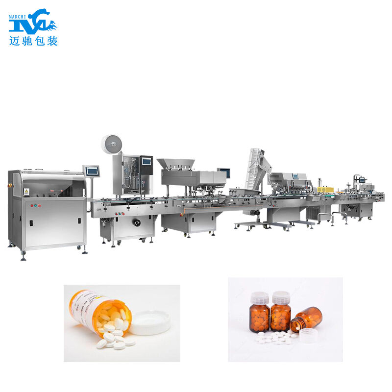 由高速理瓶機、電子數粒數片機、自動塞幹燥機或(huò)高速塞紙機、高速搓式旋蓋機、電磁感應封口機(jī)、不幹膠伺貼(tiē)標機(jī)等設備組成。